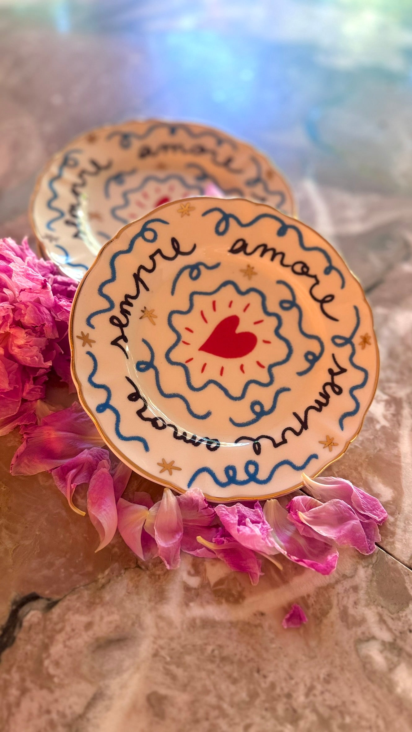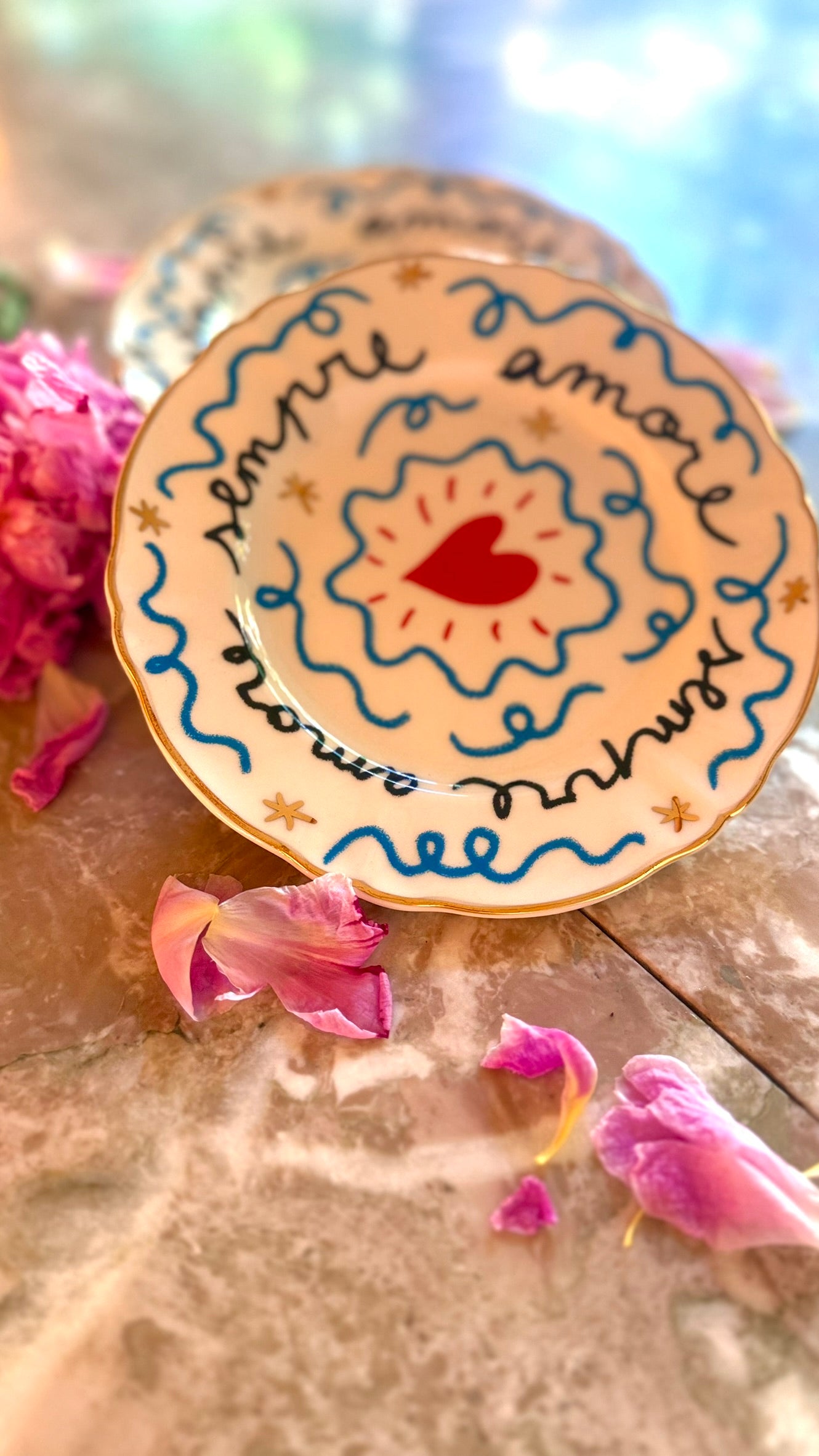 Il piatto è un elegante pezzo di ceramica decorato con un design vibrante e giocoso. Al centro, spicca un cuore rosso circondato da linee ondulate blu che creano un effetto dinamico. Attorno al cuore, l'iscrizione "sempre amore" è scritta con un tratto nero, arricchita da piccoli dettagli dorati a forma di stelle. Il bordo del piatto è finemente rifinito con una sottile linea dorata, aggiungendo un tocco di classe. Il contrasto tra i colori vivaci e la delicatezza della ceramica rende questo piatto un oggetto decorativo ideale per chi cerca un tocco di originalità e stile.