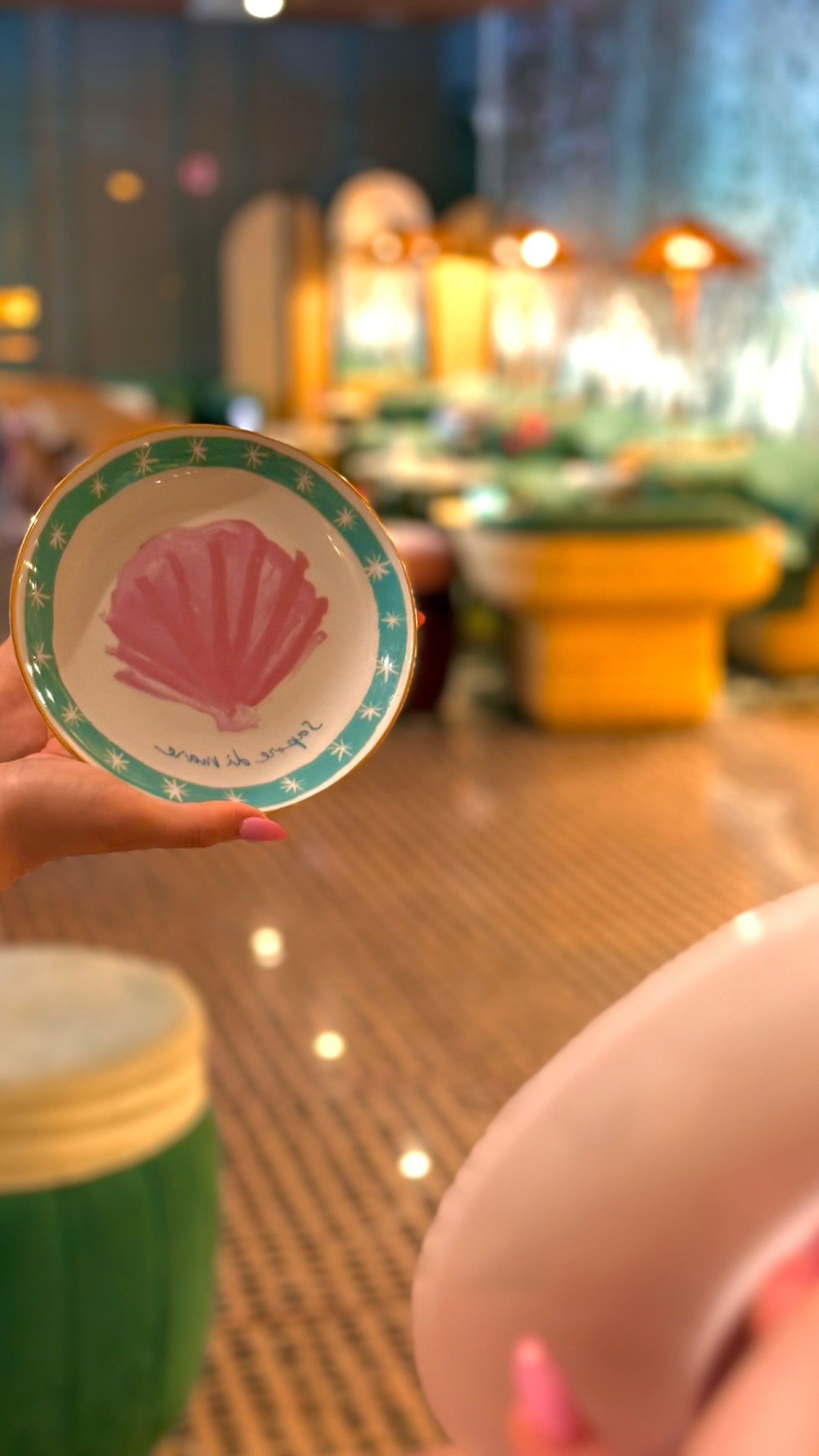Questo piatto ha un'estetica giocosa e marina, perfetta per evocare atmosfere estive e spensierate. Al centro domina una grande conchiglia rosa, dipinta a mano con tratti morbidi e stilizzati, che richiama il fascino del mare e delle sue creature. Il bordo del piatto è decorato da una fascia verde acqua punteggiata da piccole stelle bianche, creando un contrasto fresco e allegro. Il tocco dorato che rifinisce il bordo dona una nota elegante e luminosa. In basso, sotto la conchiglia, è scritta la frase "Sapore di mare", che suggella l’anima del piatto: un omaggio nostalgico e leggero alla vita balneare.