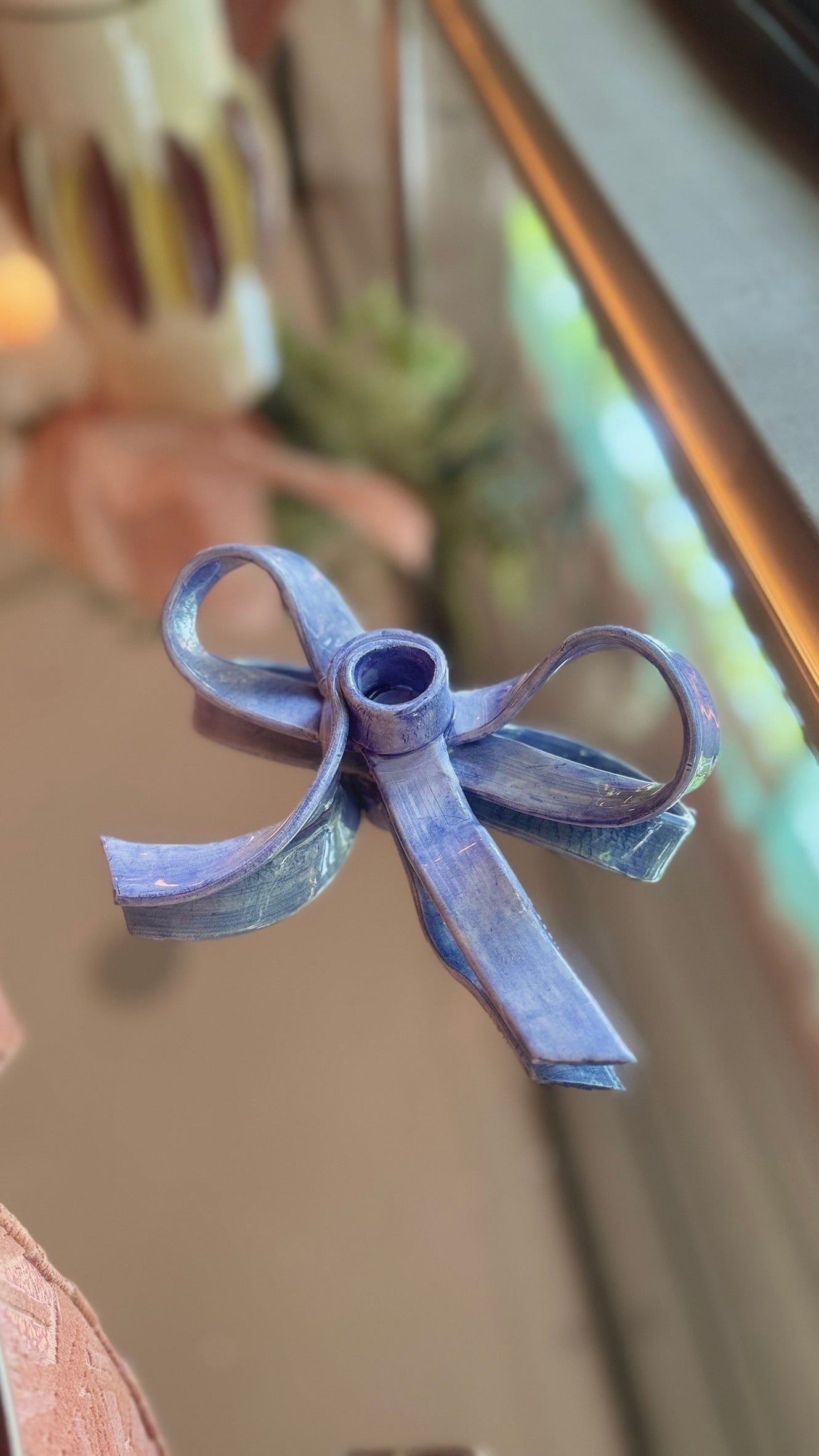 Questo porta candela in ceramica, dalla forma di un fiocco annodato, si distingue per la sua tonalità blu profonda con riflessi cangianti che richiamano la lucentezza della seta. Il design è delicato ma deciso, con nastri che si piegano e si sovrappongono con grazia, creando un effetto tridimensionale raffinato. Il foro centrale, discreto ma funzionale, accoglie una candela sottile, trasformando il fiocco da semplice elemento decorativo a oggetto d’arredo poetico e luminoso. Perfetto per aggiungere un tocco di charme su una mensola, una console o una tavola elegante, questo pezzo unisce l’arte della ceramica a un’estetica romantica ma contemporanea.