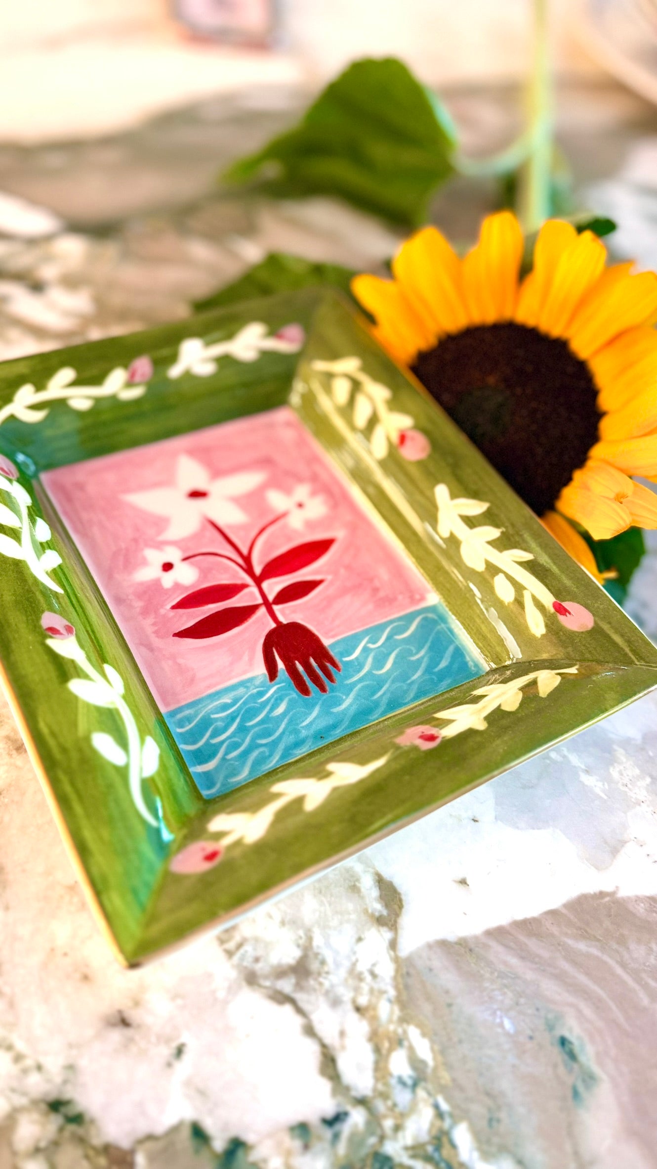 Questo svuotatasche in ceramica è una piccola opera d’arte che unisce natura, colore e poesia visiva.
