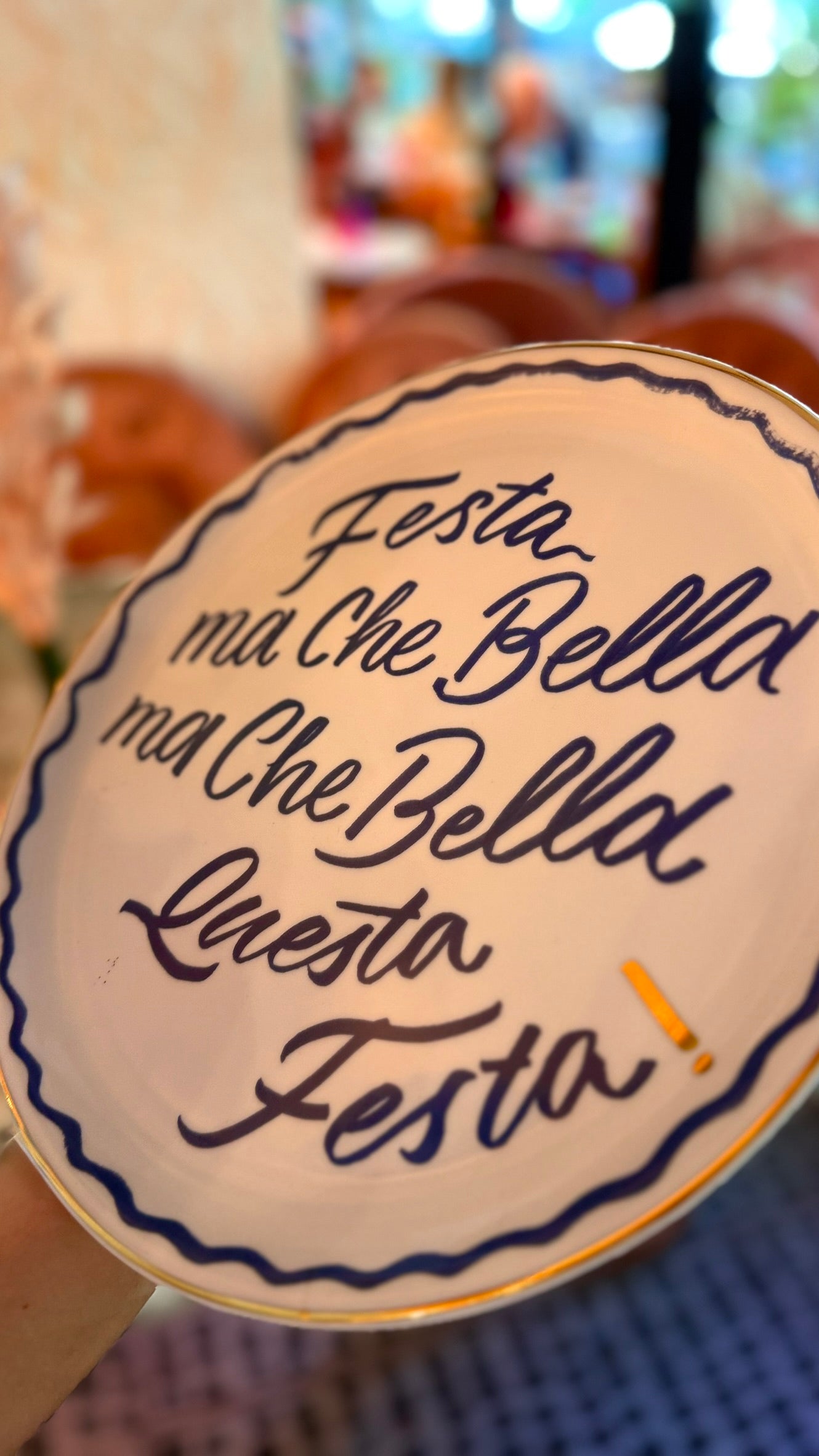 Questo piatto in ceramica è un omaggio alla gioia, alla leggerezza e all’allegria della vita italiana. La frase dipinta, “Festa, ma che bella, ma che bella questa festa”, evoca spensieratezza e buonumore, diventata simbolo di ottimismo e convivialità.