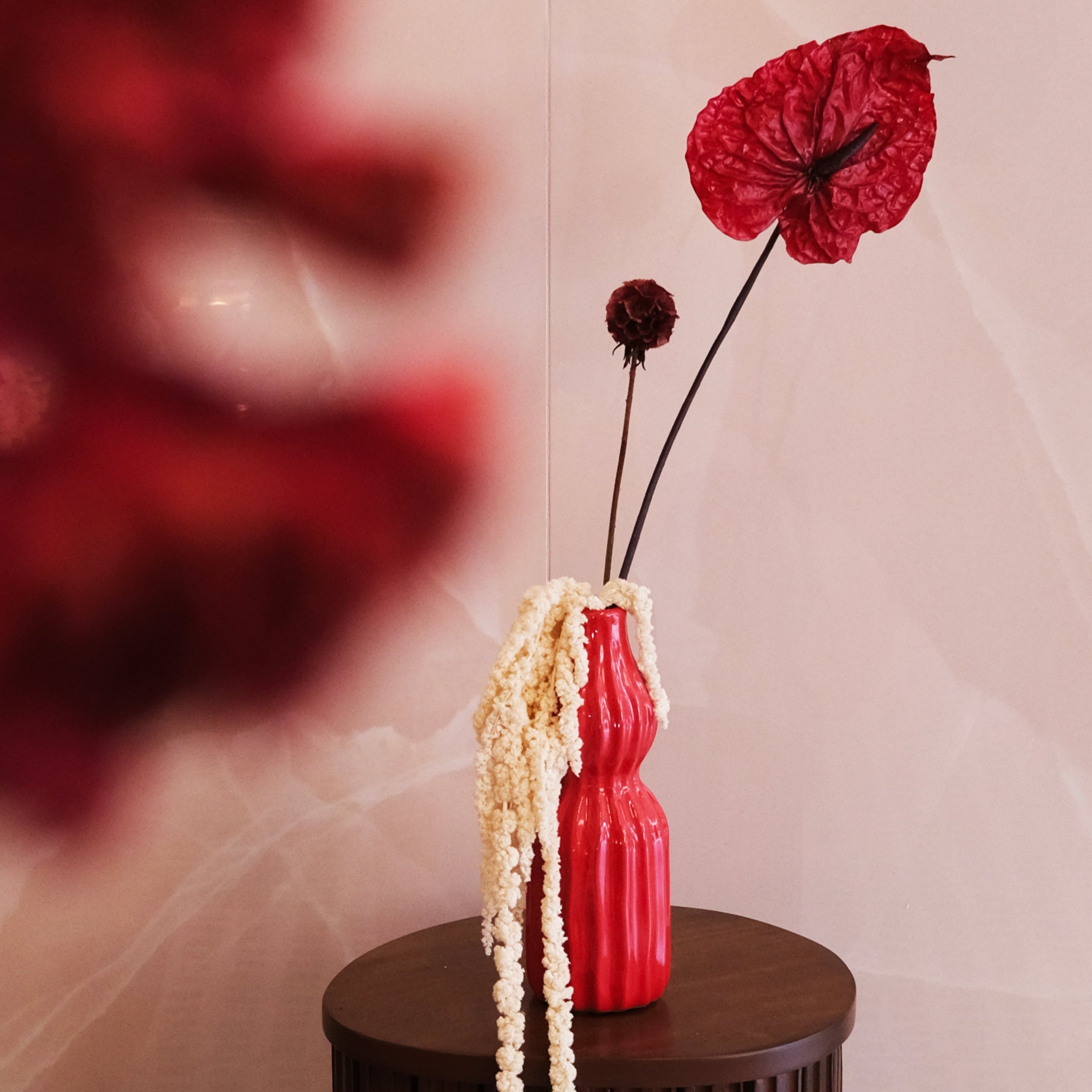 The Anthurium Rouge Vase is made with high quality stabilized flowers, designed to last over time and give a touch of elegance to your home.
