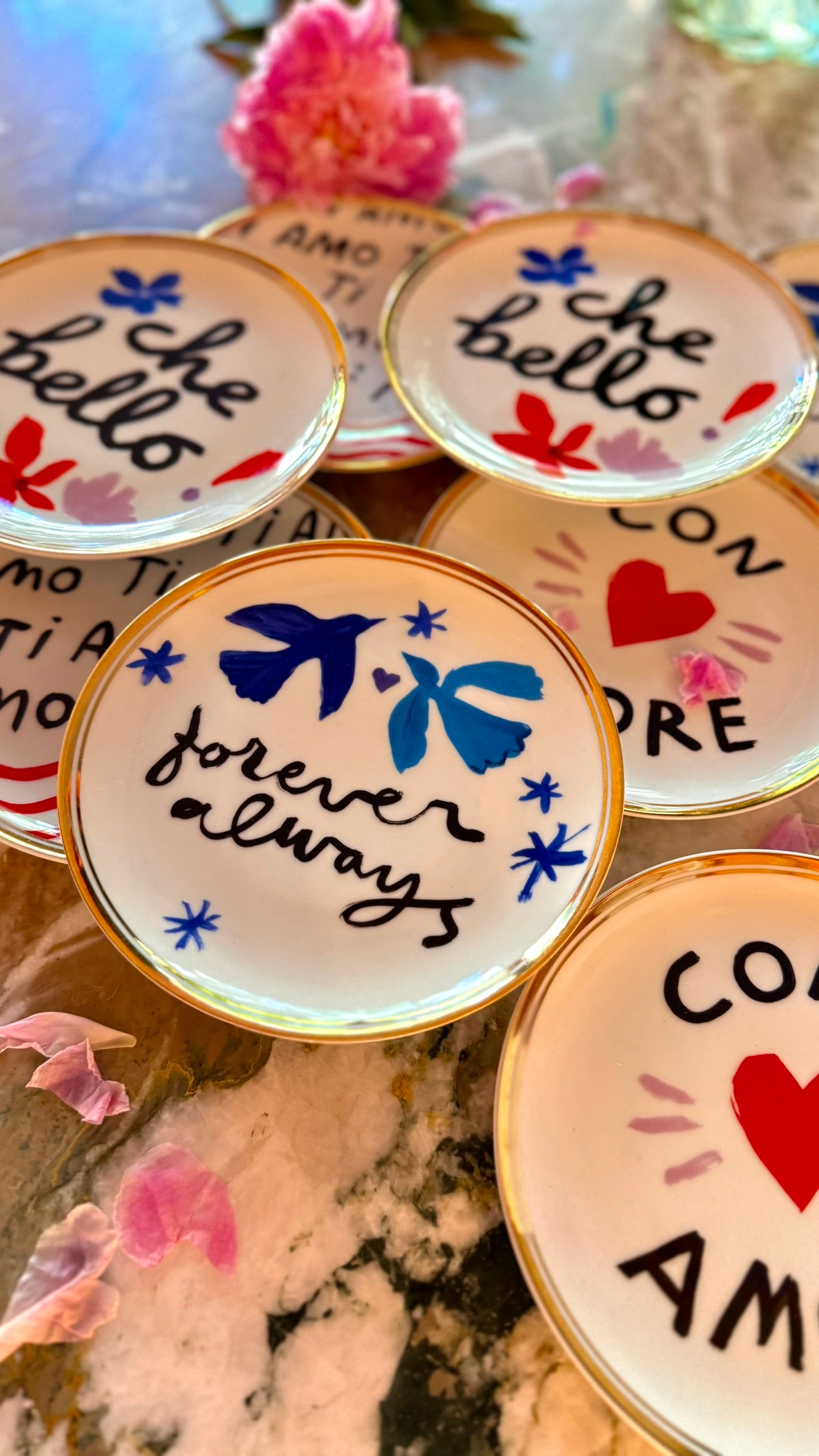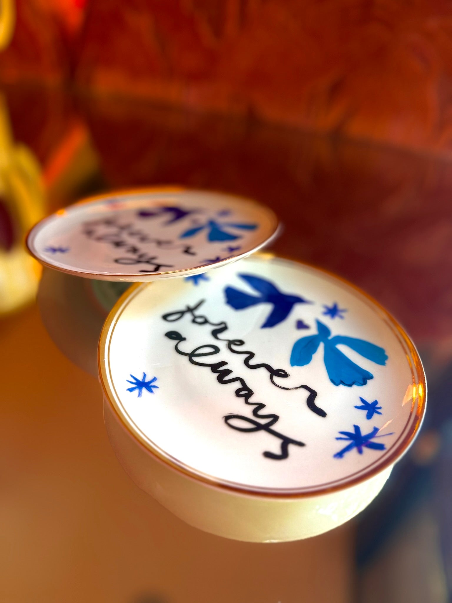 Un piattino dal tocco delicato, decorato con due uccellini blu, piccole stelline e la scritta “forever always”. Un oggetto che parla di affetto e di legami che restano nel tempo.