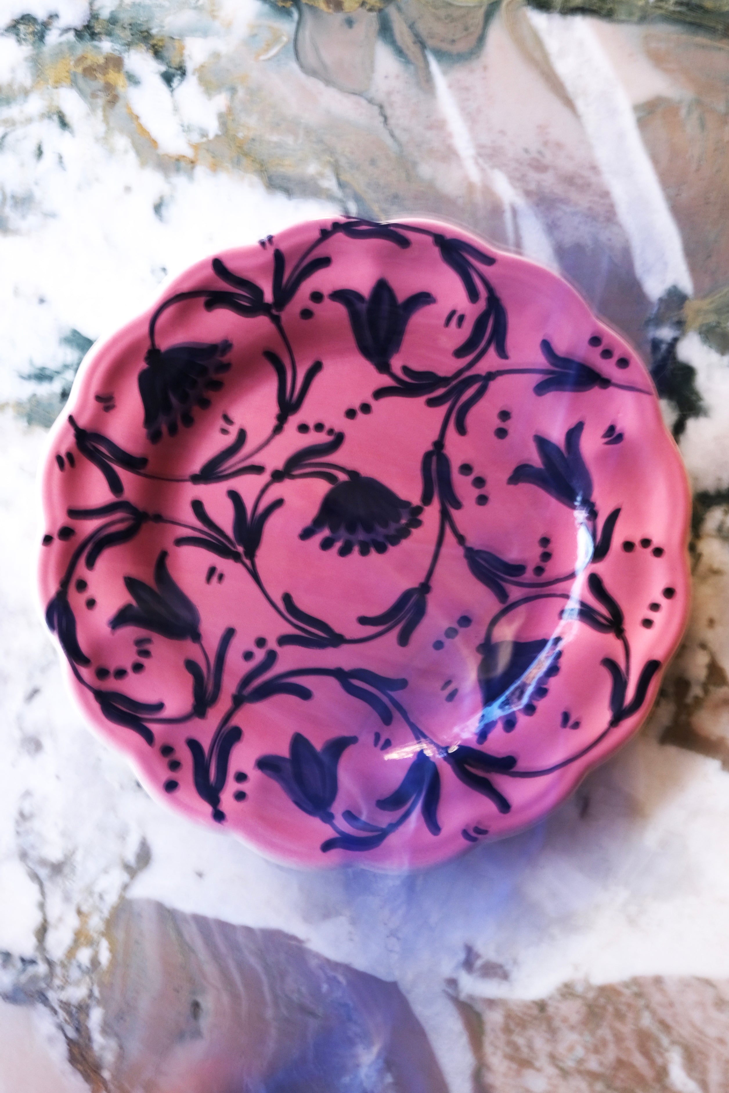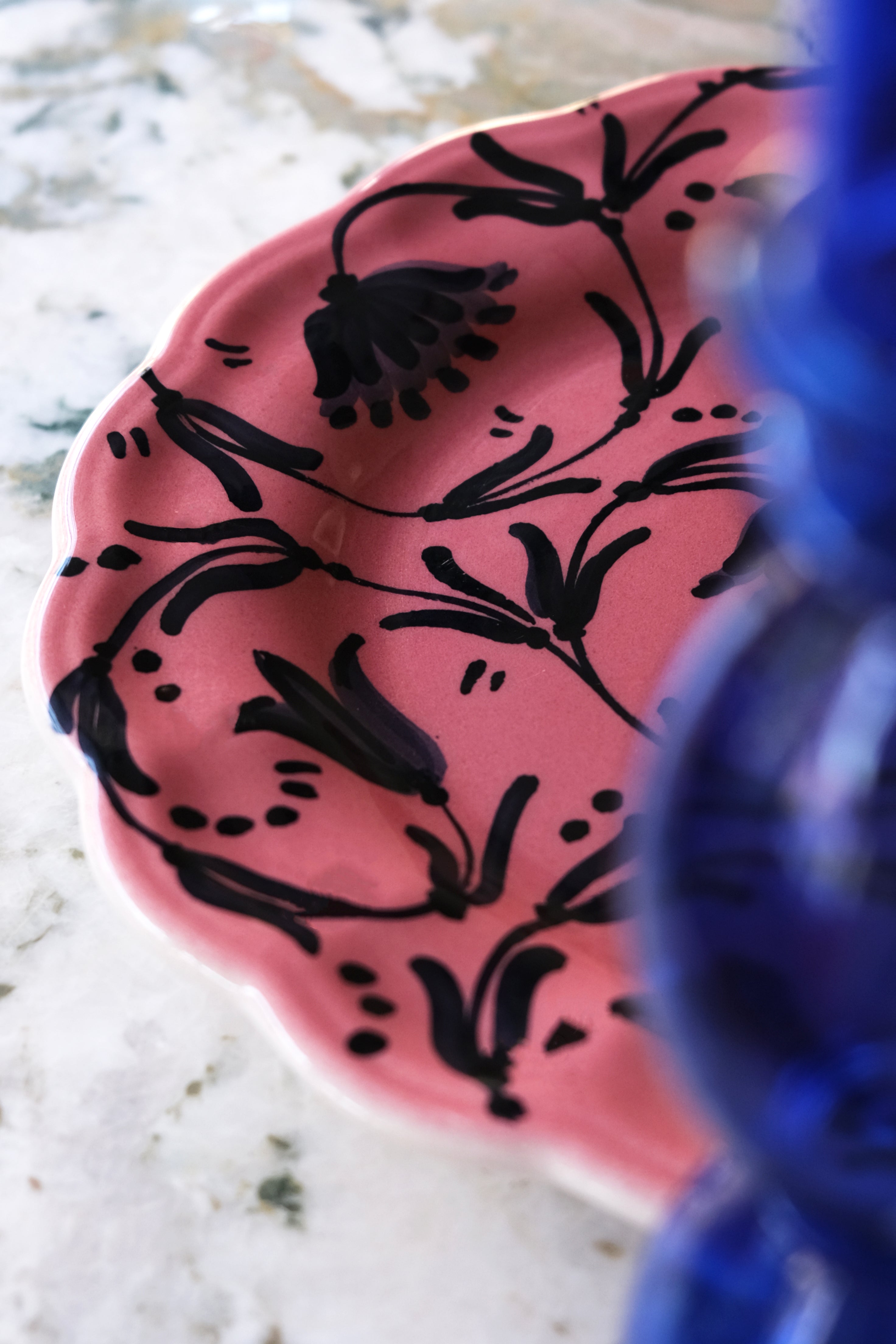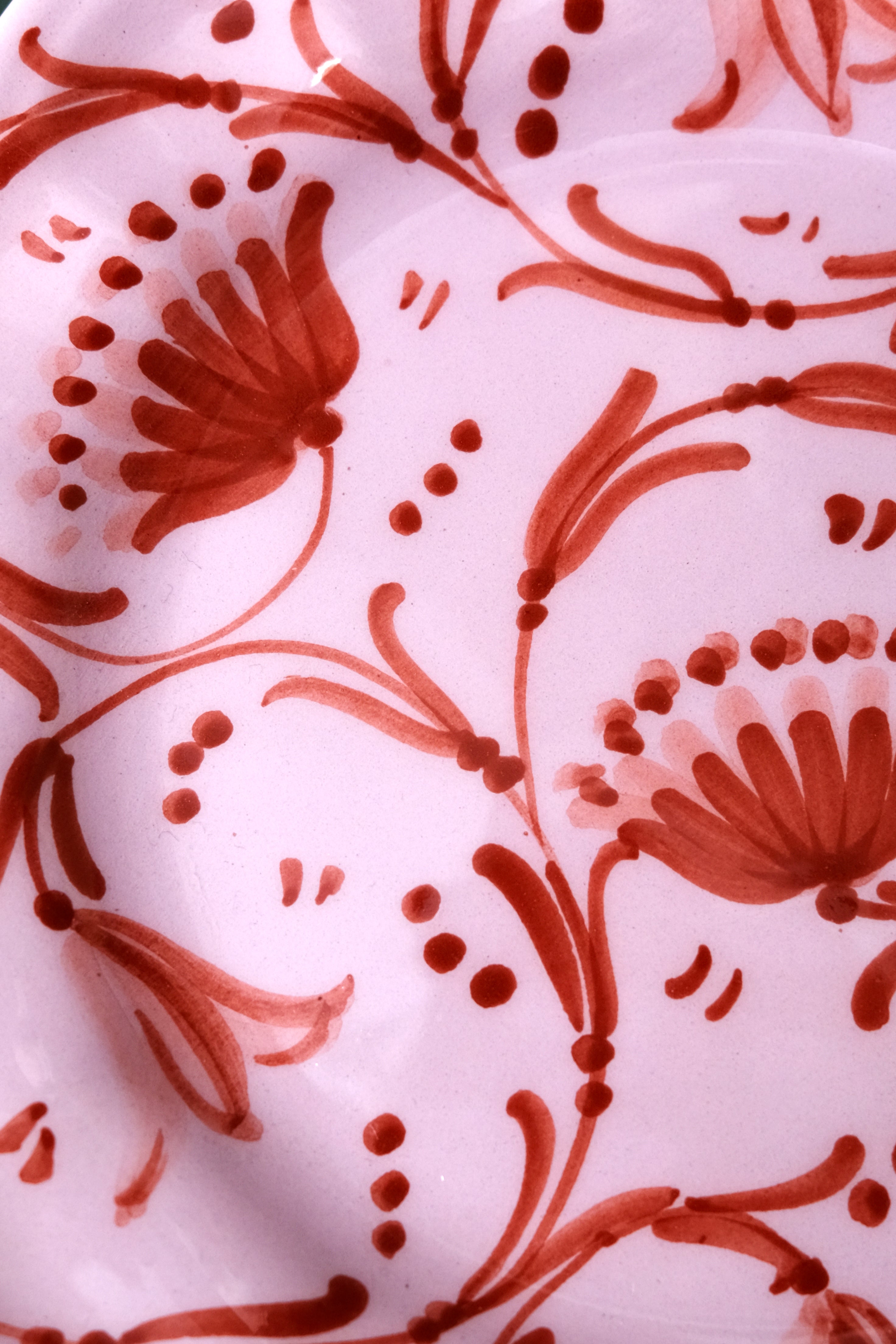 Piatto da portata dipinto a mano, adornato con una delicata decorazione floreale in verde acqua e rosa e bordi smerlati. Ogni piatto è un'opera d'arte unica che porta un tocco di eleganza e raffinatezza alla tua tavola. Perfetti per aggiungere un tocco di lusso a ogni pasto.