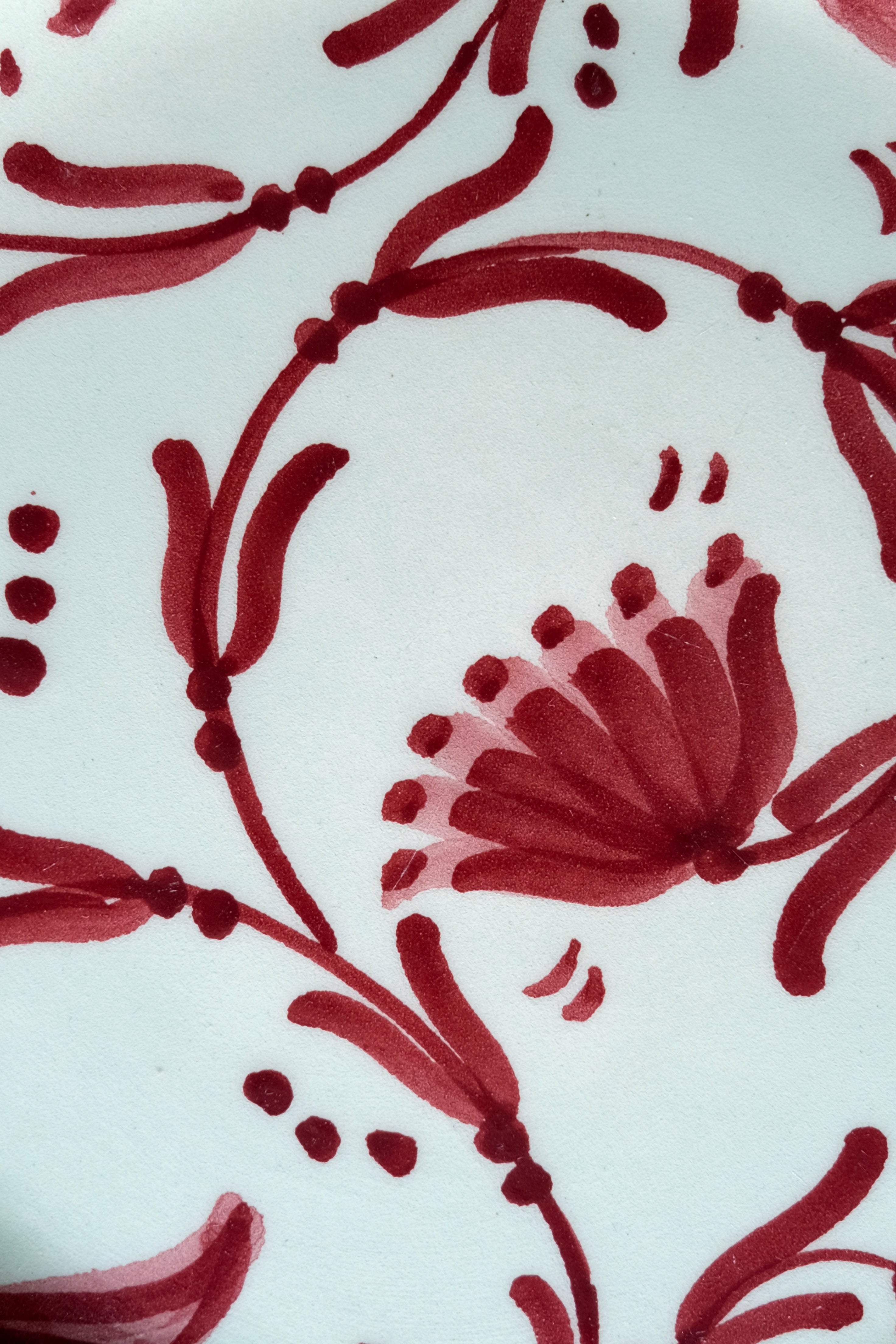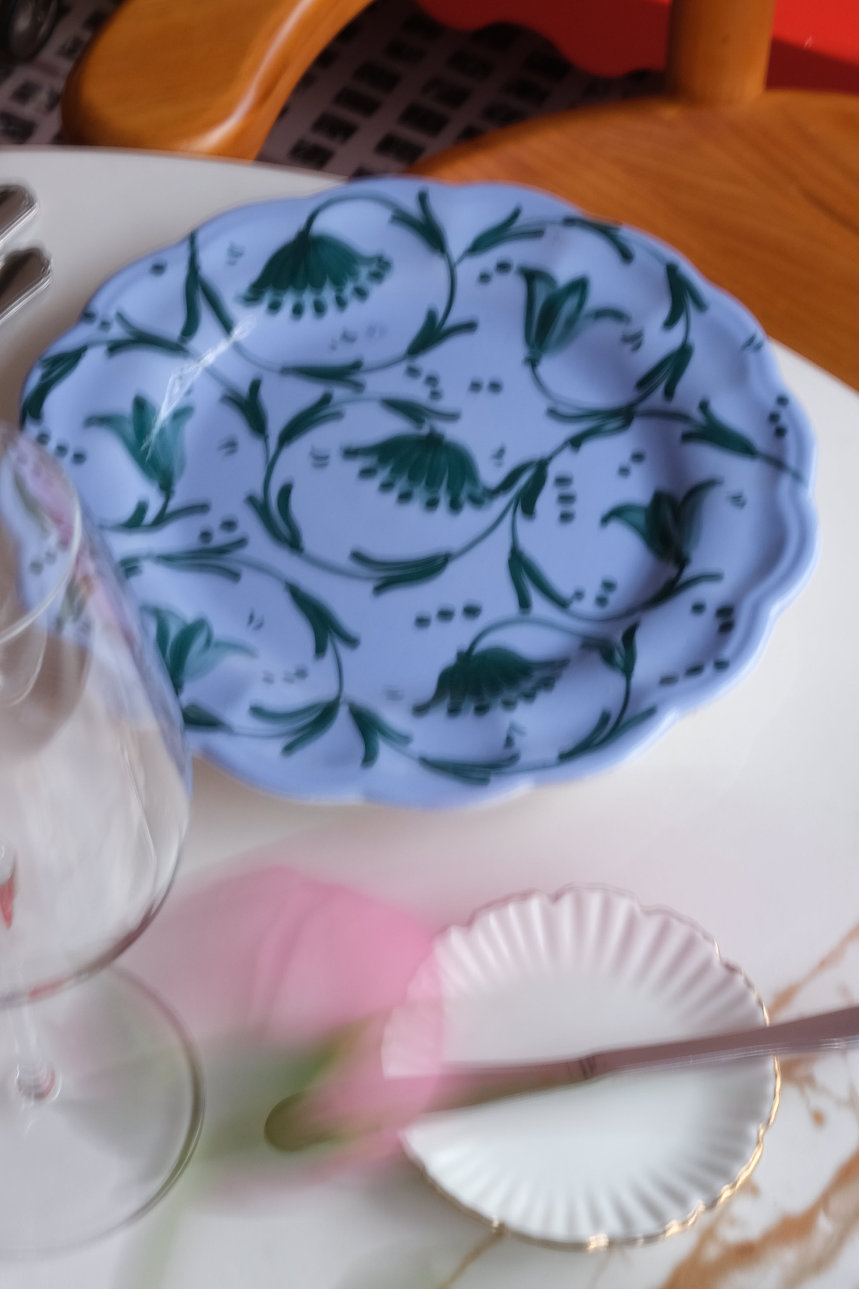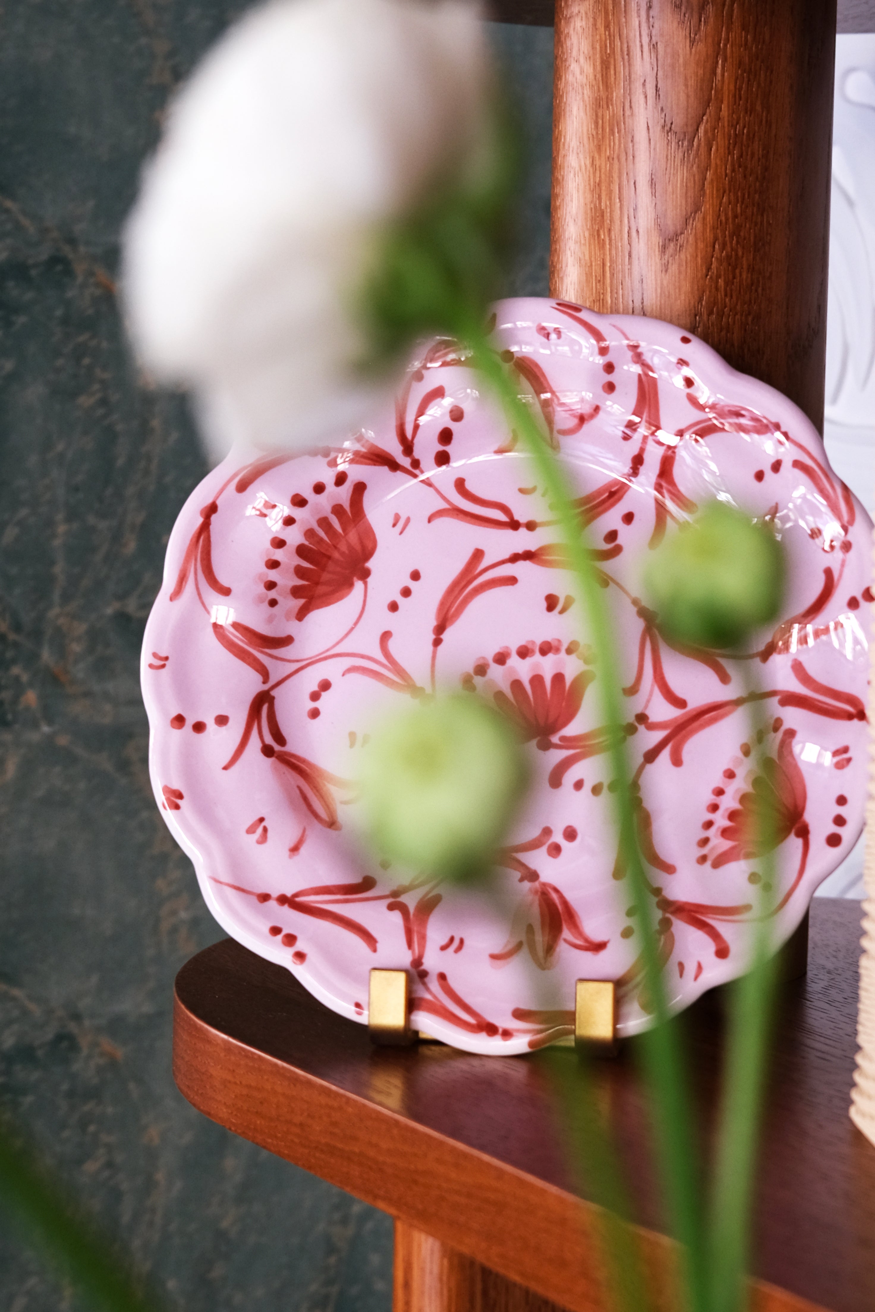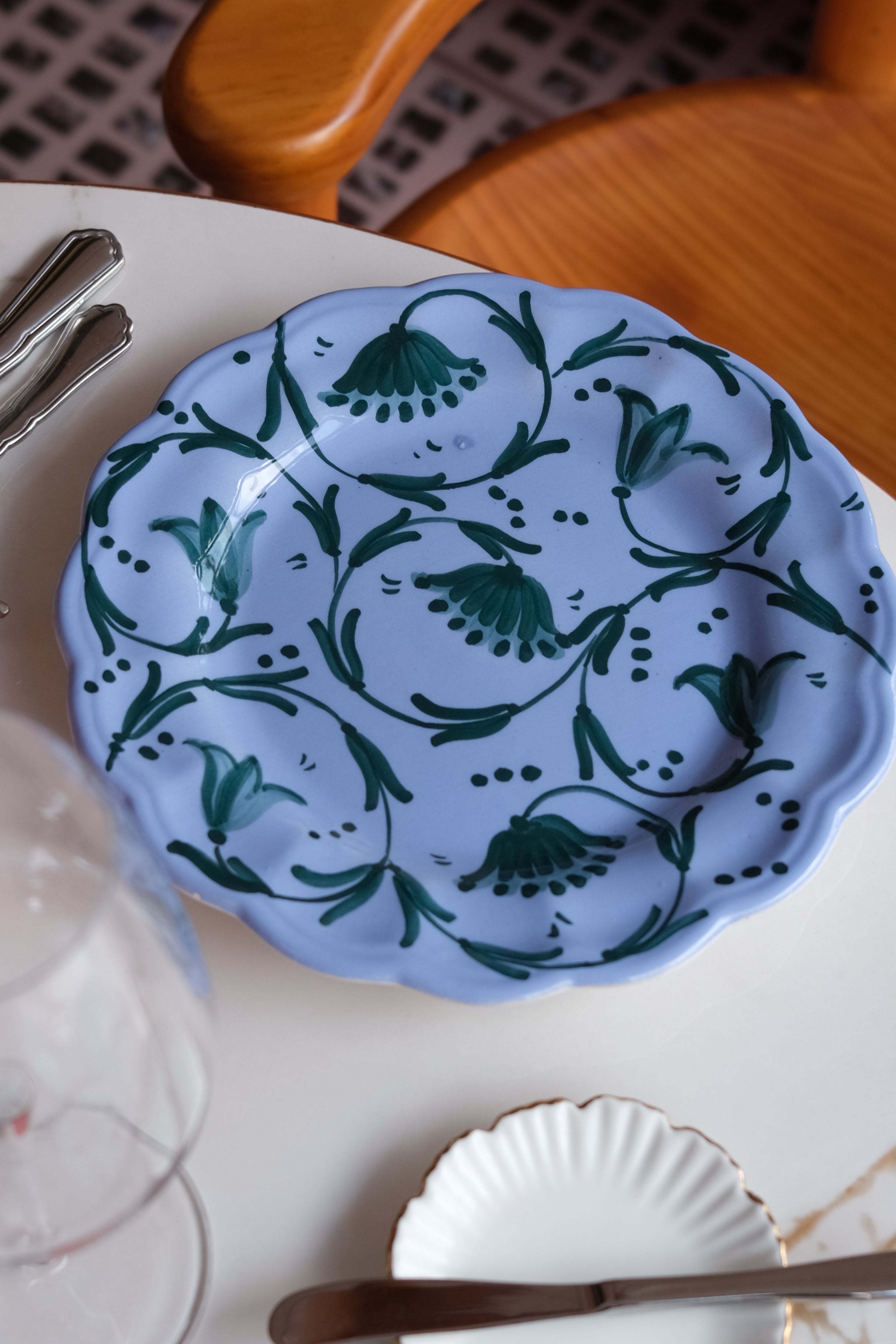 Piatto da portata dipinto a mano, adornato con una delicata decorazione floreale in verde acqua e rosa e bordi smerlati. Ogni piatto è un'opera d'arte unica che porta un tocco di eleganza e raffinatezza alla tua tavola. Perfetti per aggiungere un tocco di lusso a ogni pasto.