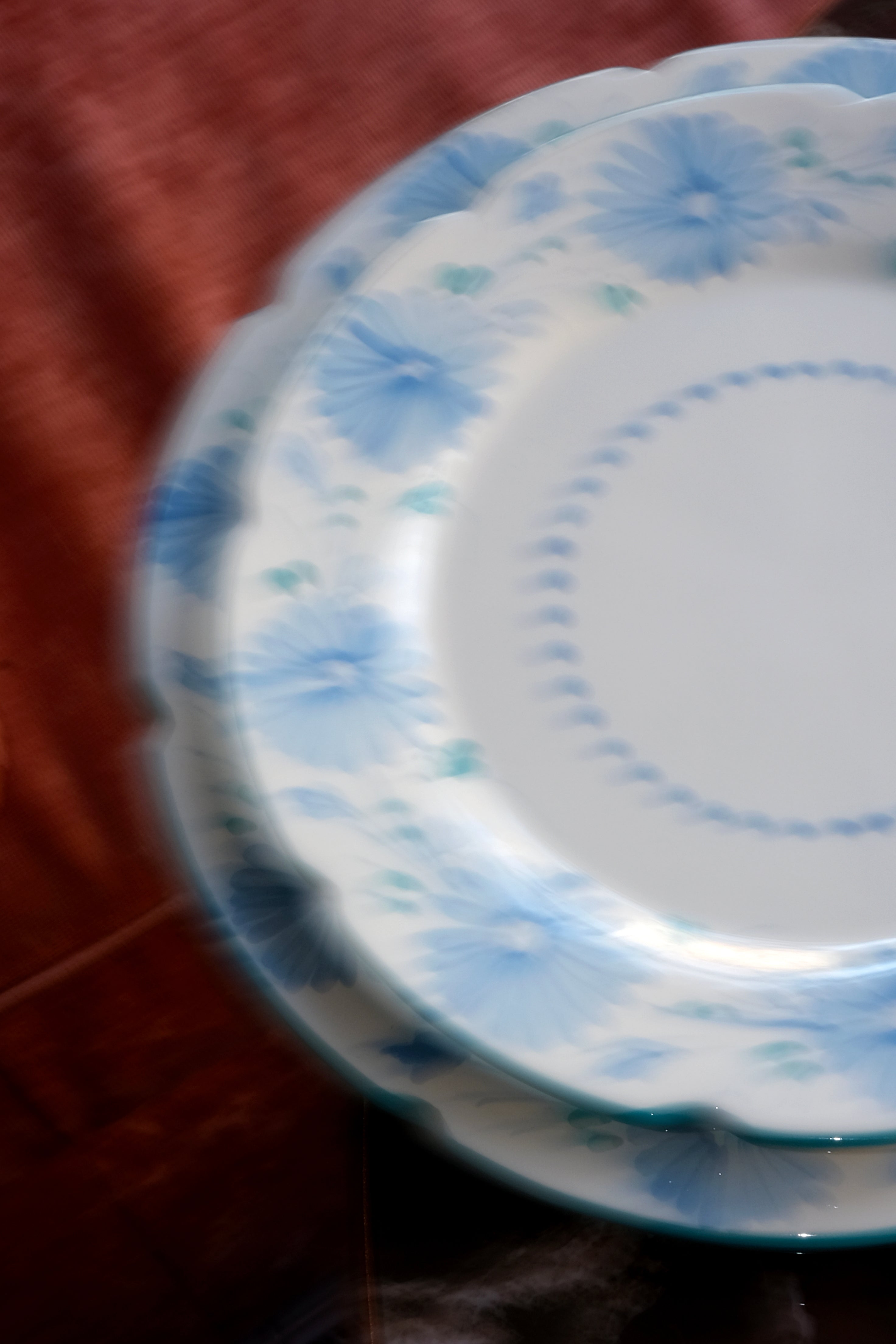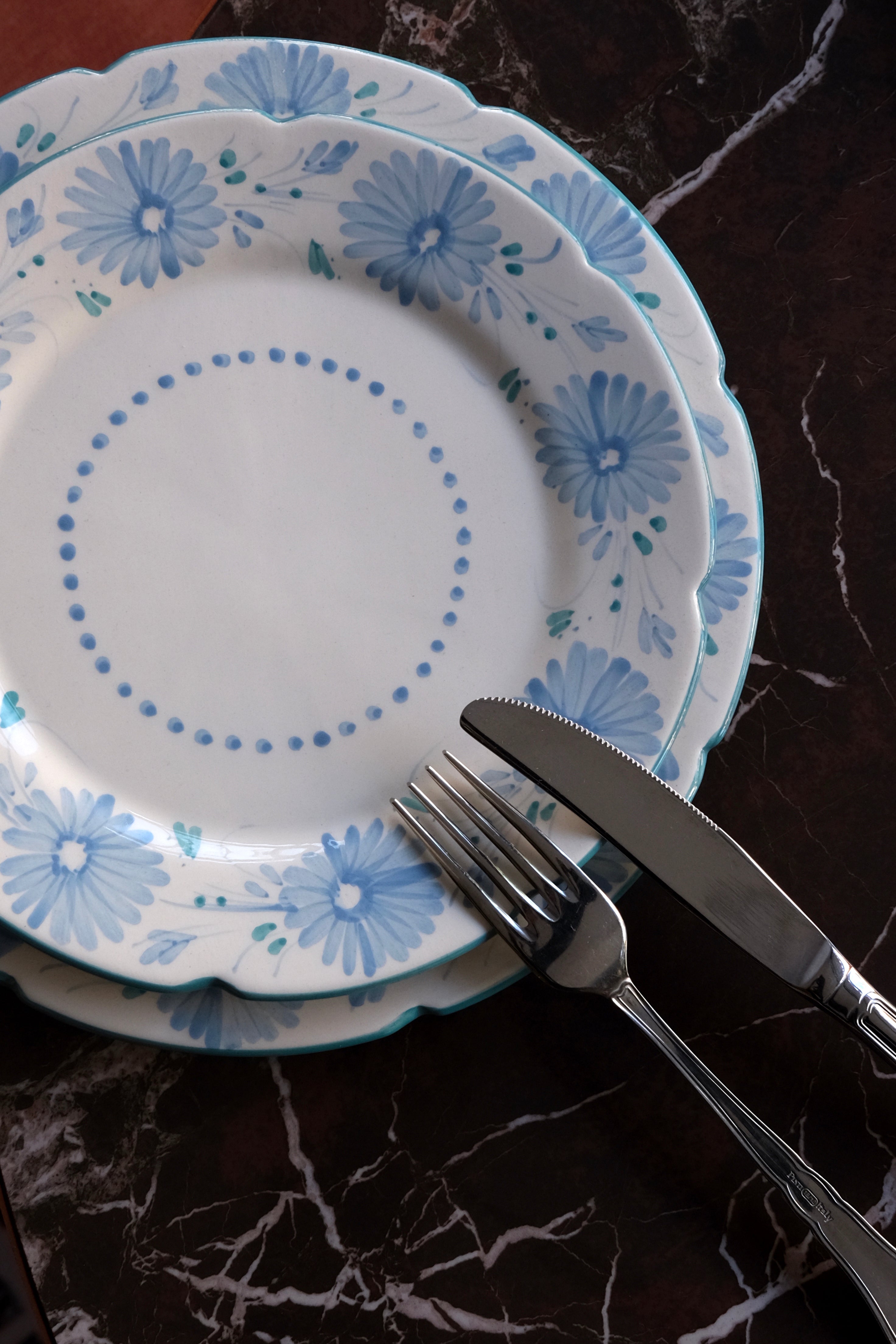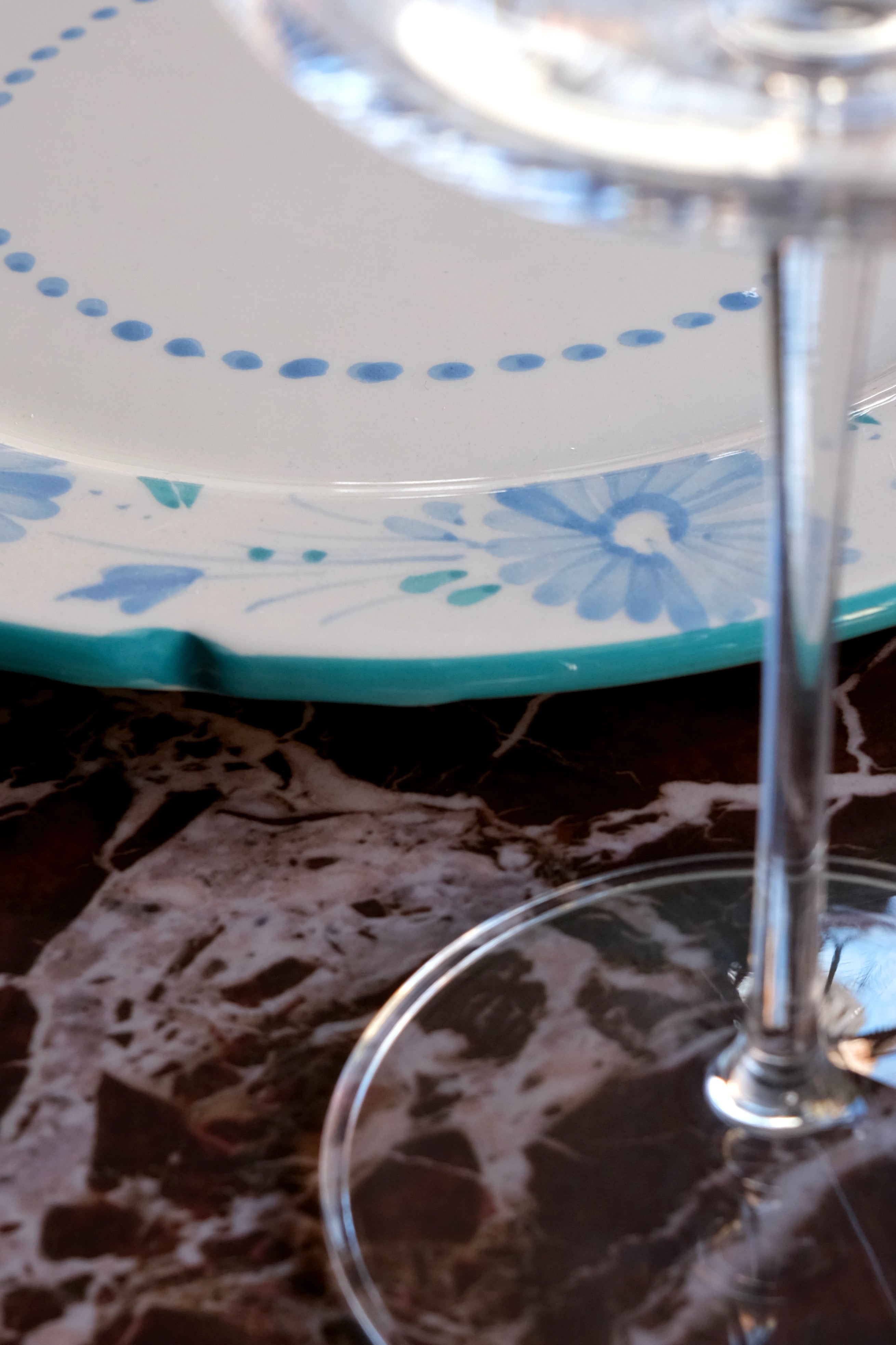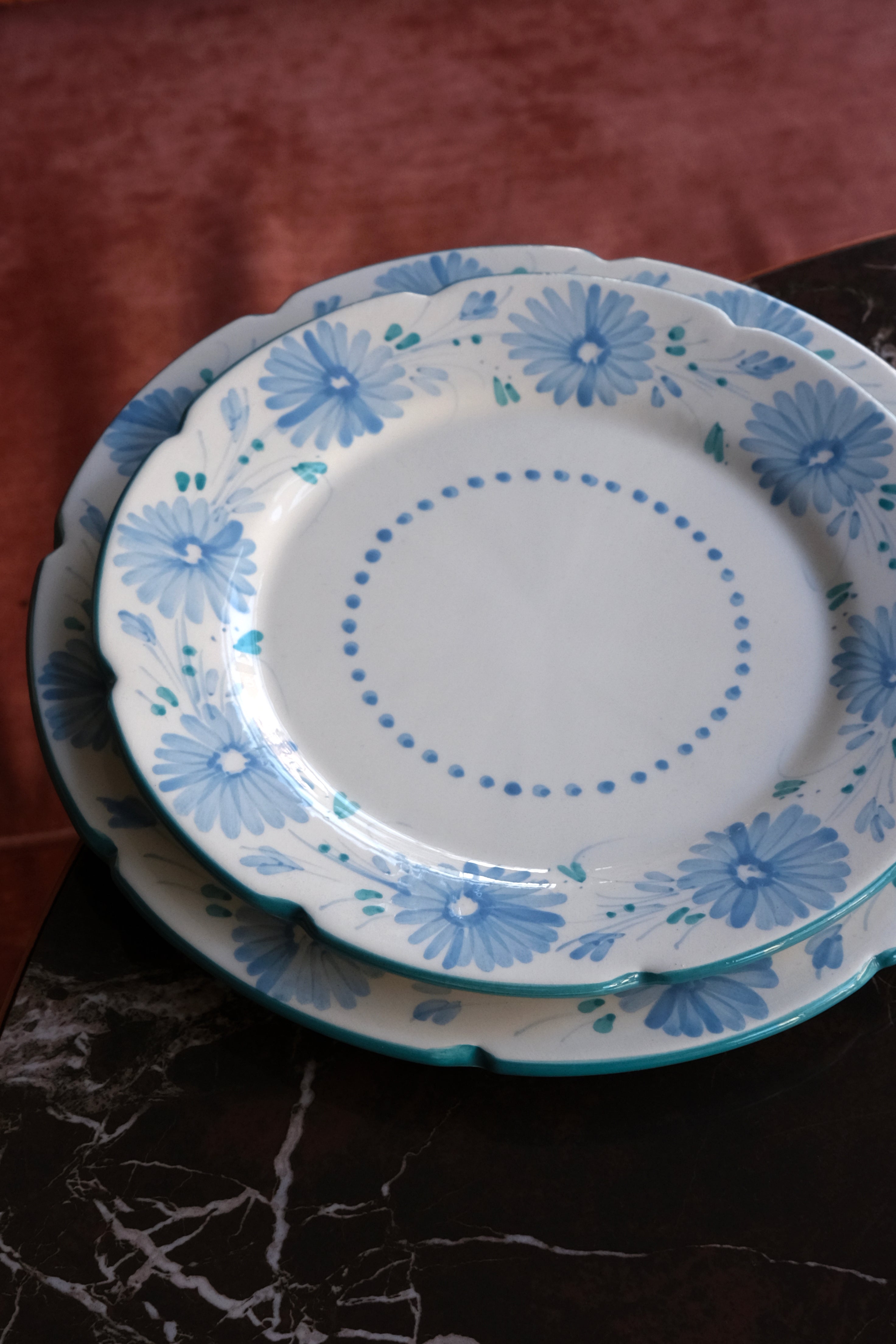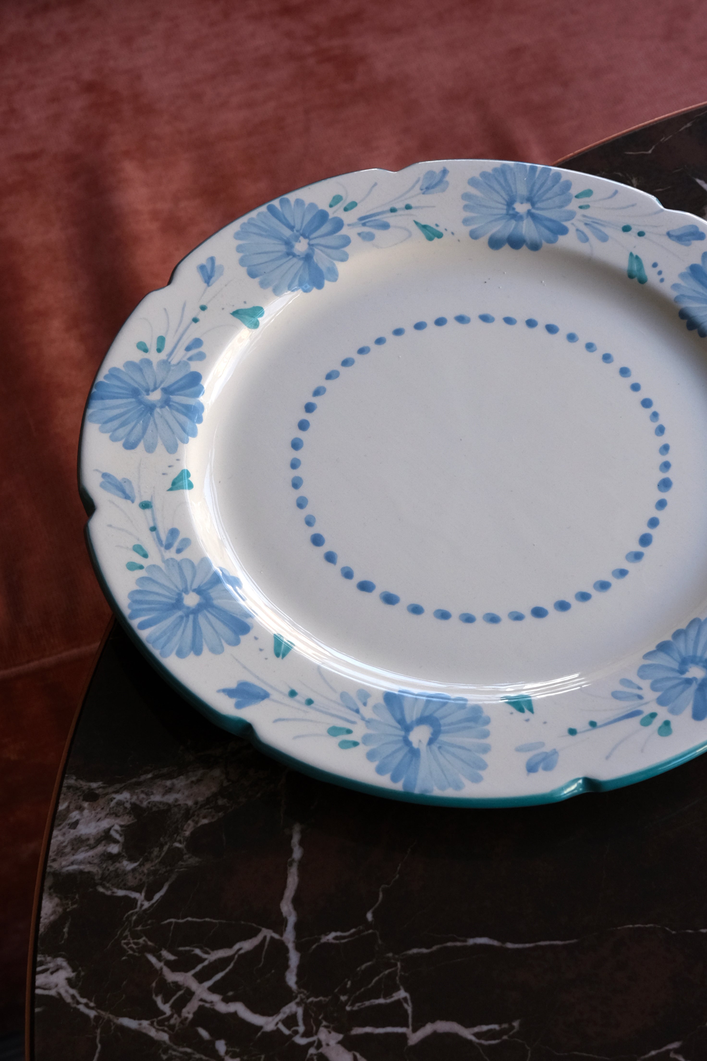 Piatto da portata dipinto a mano, adornato con una delicata decorazione floreale in verde acqua e rosa e bordi smerlati. Ogni piatto è un'opera d'arte unica che porta un tocco di eleganza e raffinatezza alla tua tavola. Perfetti per aggiungere un tocco di lusso a ogni pasto.